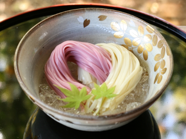 紅色のうどんは梅肉を練り込んだうどんで、風味が香るすっきりとした味わいをご堪能いただけます。