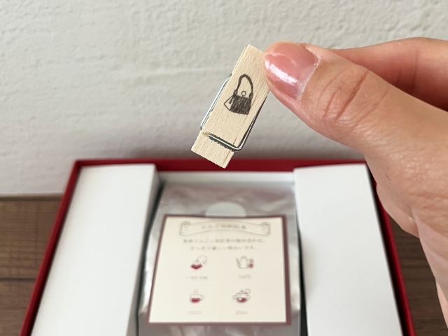アルミパックを留めておくのに便利な小さな木製クリップにはムーミンママのハンドバッグのワンポイント入り。