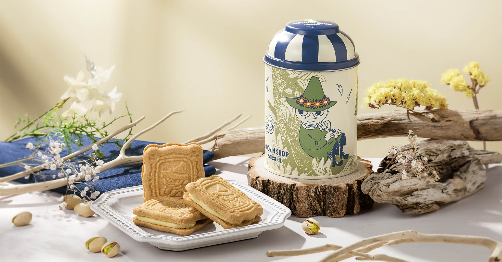 スナフキンが木の上で旅の途中にひと休み。そんな穏やかな情景を閉じ込めた、やさしい色合いのデザイン缶。「ムーミンショップ パティスリー」らしいストライプの蓋がアクセントになった、ナチュラルで大人かわいいアイテムです。中には『クリームサンドクッキー』の<ピスタチオ味>を3枚詰め合わせました。スナフキンが旅の途中でひと休みするように、『クリームサンドクッキー』を食べてほっと一息ついてくださいね。